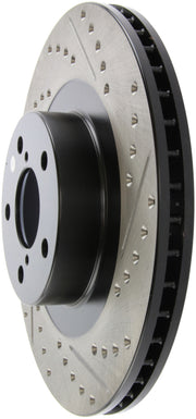 StopTech Drilled and Slotted Sport Rotors are 1-piece direct replacement brake discs for factory brake systems and stock calipers that look great behind your wheels – and offer significantly improved braking performance. The unique cross-drilling and slotting aids with heat and brake dust dispersal; prevents glazing of the pads; adds bite and improves wet and dry braking performance. Built to last; the black e-coating provides protection from corrosion and the high carbon metallurgy (in most applications) offers quieter operation; better crack resistance and increased performance.